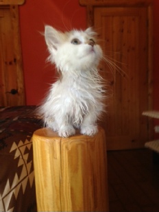 Do NOT use an over-the-counter cheap pet shampoo. These will not give you the heightened level of beauty that you can achieve with an appropriate show shampoo. Personally, I use Chris Christensen’s White on White for my high white cats (mostly white cats). I follow this up with Chris Christensen’s Thick and Thicker, then the After Bath. Between each application, I rinse, rinse, rinse. If there’s anything you cannot overdo in bathing your cat, it is rinsing. When you think you are done rinsing, rinse again. Your cat’s coat should have a squeak to it when you try to pass your hand over it. There will be some resistance to smoothing your hand over her coat. This is what you are looking for. Note: Some professional exhibitors use a teaspoon of vinegar to one gallon of water to rinse their cat, but I’ve never tried this. I find that rinsing with water works well enough.